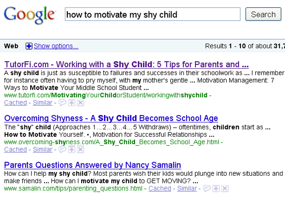 Getting back to the example above, if you were that desperate parent and you searched on Google.com with the words, "how to motivate my shy child". Here's what you would find.