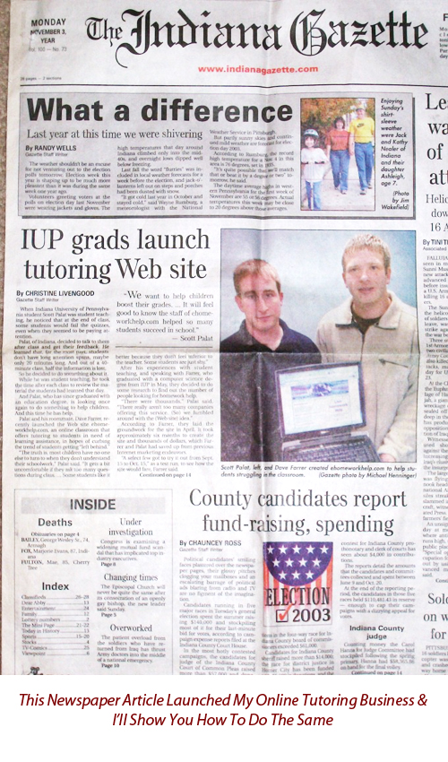 From my passion, Ehomeworkhelp.com was created (see front page newspaper article below). Our technology was so new that our small town of Indiana, PA picked up on us quick. In late 2003, I bought out my former partner and moved away from a homework help service to create live-etutor.com in 2004. Soon after this, we mastered the art of acquiring clients in this new "exploding" online tutoring industry. Over the next year, I learned a lot and was ready to take my online tutoring business to the next level.